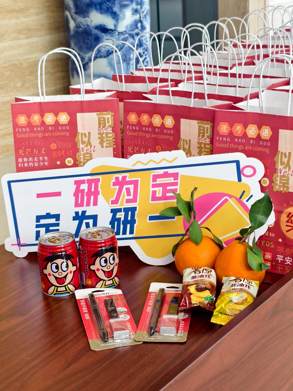 班主任与班级代表们为每位考研学子送上了学院精心准备的“考研必胜福袋”。每一份礼物都暗藏巧思、饱含深意:涂卡套装喻示“笔下生辉”,鲜橙承载“心想事成”,薯愿暗合“如你所愿”,旺仔牛奶寄寓“前程旺达”。手捧沉甸甸的“福气”,笑声与感动在会场交织。橙香四溢,“旺”气升腾,每一份心意都诉说着:学院与你,并肩同行!