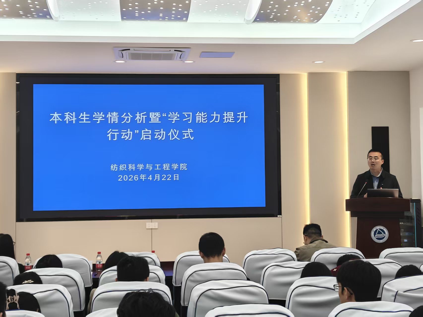 2026年4月22日,纺织科学与工程学院学情分析暨“学习能力提升行动”启动仪式在纺院A103报告厅举行。纺织科学与工程学院党委书记张菁燕,党委副书记、副院长王恒,副院长刘庆生、戴磊,纺织工程系主任周建,优秀班主任代表李蔚出席活动。学院全体辅导员、本科生班主任、各班班长与学习委员参加活动。活动由辅导员孙洲龙主持。