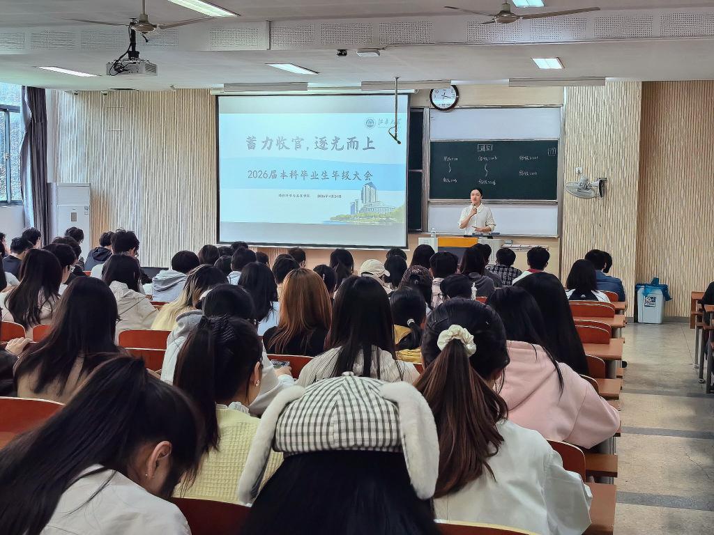 4月24日,纺织科学与工程学院2026届本科毕业生“蓄力收官,逐光而上”主题年级大会于第一教学楼1B103召开,2022级本科生辅导员伏曦及全体本科应届毕业生参会。