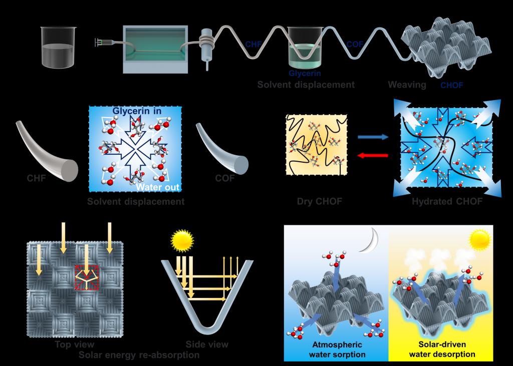 该研究介绍了一种蜂巢结构有机凝胶织物(CHOF),通过独特的渗透压驱动机制与光热协同设计,突破传统技术瓶颈。该材料以海藻酸钙骨架包裹吸湿性甘油溶液,内部渗透压高达184.7 atm,可动态刷新吸脱附位点:夜间通过氢键捕获空气中的水分子,并借渗透压将水分从表面输运至内部存储;白天利用负载的碳黑(CB)颗粒与蜂巢结构的光捕获效应(实现97%光吸收率),在1太阳光强下30分钟内表面温度升至69°C,驱动水分快速脱附。基于成熟纺织编织技术,CHOF可规模化制备至米级(0.25×0.45 m)且性能无明显衰减,每日可实现多次吸脱附循环,室外实测日产水量达6.70 kg m⁻² day⁻¹。
