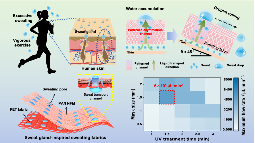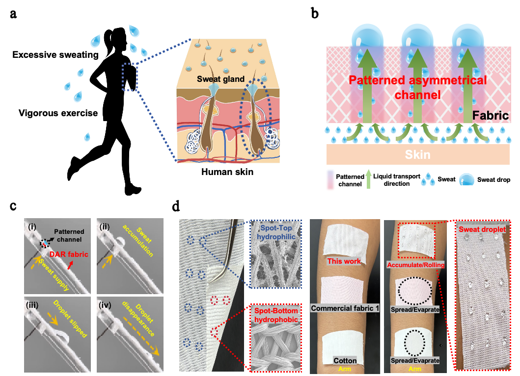 该研究受人体汗腺启发,成功开发出一种具有图案化不对称结构的“排汗织物”,使每个单独的汗液传输通道都具有物理和化学不对称性(孔径差异和局部渐变润湿性),使织物像皮肤一样通过“汗腺”通道将汗液反重力定向输送至织物外表面并聚集成汗滴,随人体摆动可轻松滑落(滚动角约45°)。该排汗织物的单向导水速率高达12.2 mL·cm-2·min-1,远超人体出汗速度,实现了可持续的汗液管理。为伤口护理,生物流体监测和微流体控制的先进纤维材料的开发提供了有效策略。论文第一作者为朱豆豆博士江南大学付少海教授为通讯作者。