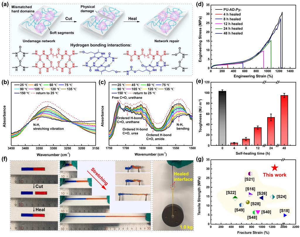 仿蛛丝氢键阵列型聚氨酯-脲网络中硬段区域内包含大量氢键受体和供体,通过不对称六元环间隔基(IPDI)与多个酰基氨基脲(-NH-CO-NH-NH-CO-)、氨基甲酸酯(-NH-COO-)和脲键(-NH-CO-NH-)连接,形成具有高密度非共价氢键相互作用的非结晶松散结构以保证有效的分子链迁移率。高密度及小尺寸氢键相互作用形成的硬段区域与较低能垒软段PTMEG共同促进了聚氨酯-脲分子链间扩散和重组,实现室温自修复性能。