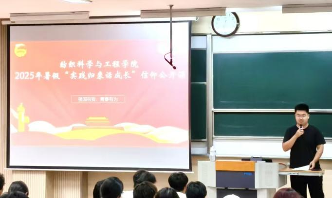 10月13日晚,纺织科学与工程学院于第一教学楼1B103举办2025年暑假“实践归来话成长”信仰公开课。2025级本科生辅导员孙洲龙、2025年暑假社会实践各院级重点团队代表及2025级全体本科生参与此次活动,会议由学院学生会团委通讯社胡欣悦主持。
