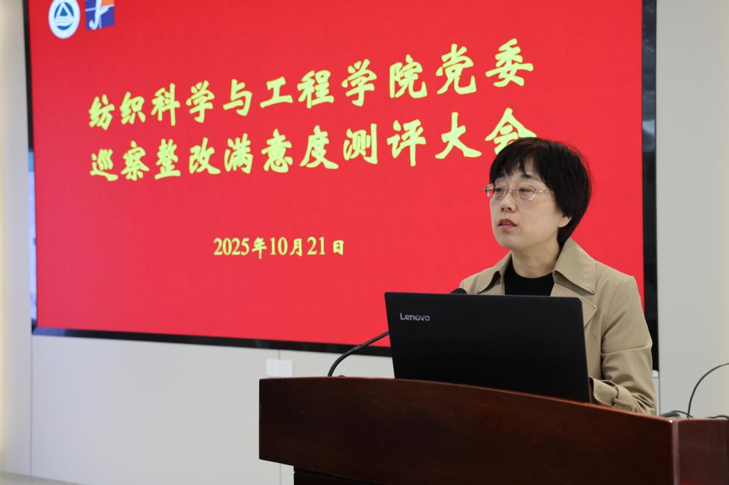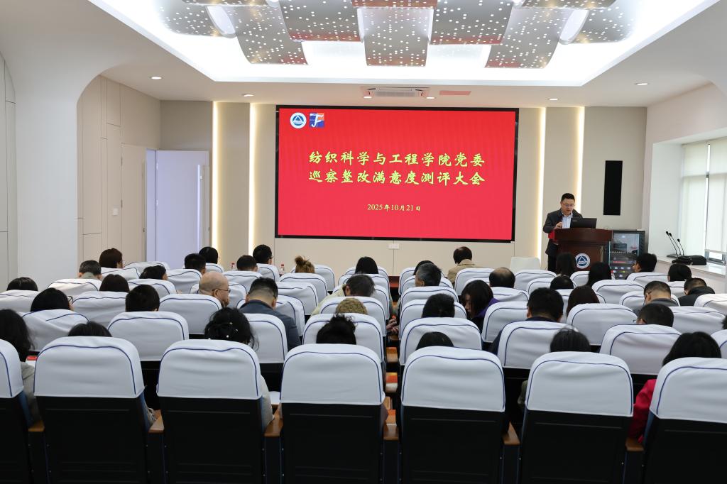 10月21日上午,纺织科学与工程学院党委在学院A103会议室召开巡察整改满意度测评大会。学校党委巡察整改专项督查第二督查组成员季王飞、夏京璟,学院党委领导班子成员、全体教职员工、学生代表参加此次会议。会议由学院院长付少海主持。
