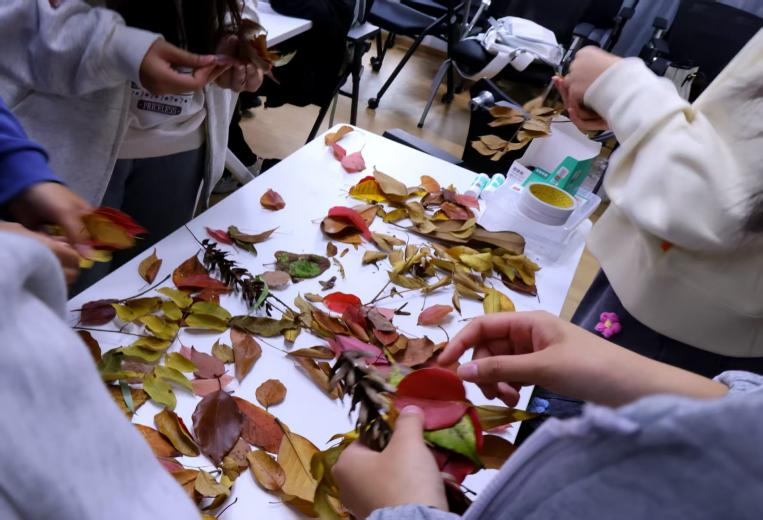 11月5日下午,纺织科学与工程学院青年志愿者协会在梅园一站式社区举办“落叶剪影×植物拓印”活动。