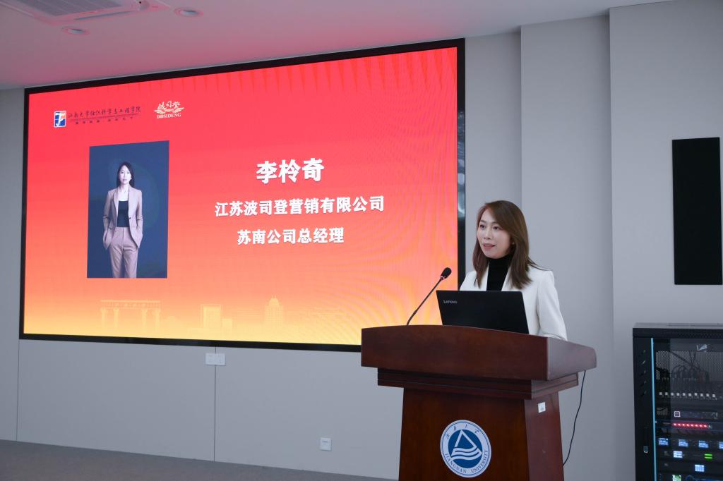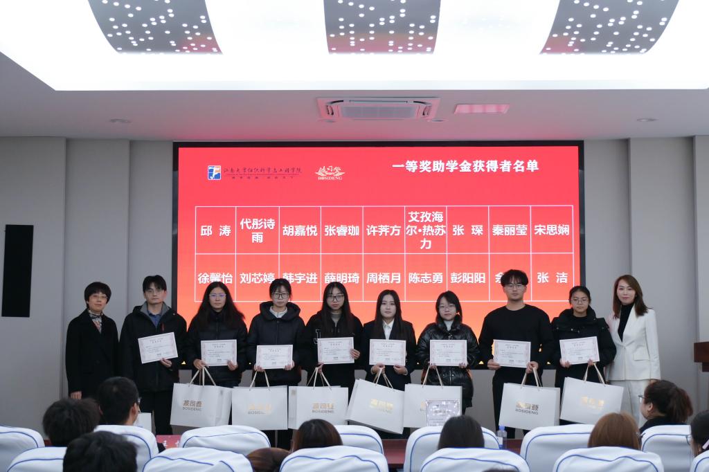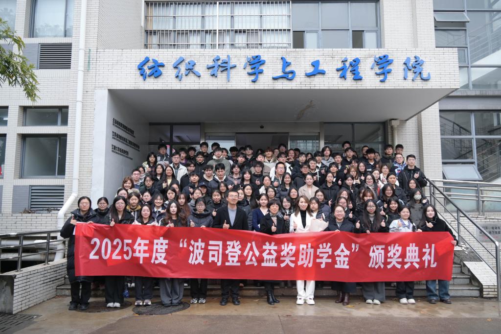 12月24日下午,纺织科学与工程学院在学院A103报告厅举行2025年“波司登公益奖助学金”颁奖典礼。江苏波司登营销有限公司苏南公司总经理李柃奇、高级零售经理周依婷,纺织科学与工程学院党委书记张菁燕、副书记兼副院长王恒以及获奖学生代表等100余人参加颁奖典礼,辅导员伍胤鸿主持典礼。