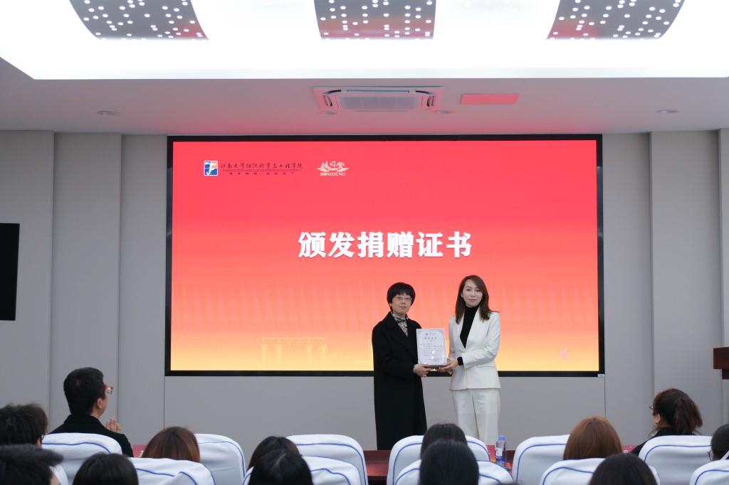 随后,受资助学生代表依次上台领奖,出席嘉宾为获奖学生颁发证书并合影留念。此次活动江苏波司登营销有限公司苏南公司还为优秀学子捐赠了16件羽绒服,同学们表示在严寒的冬日感受到了一份暖暖的爱意。纺织2204班徐馨怡作为获奖学生代表发言,她分享了自己在江南大学的成长感悟与收获,表示将继续坚定报国理想,不负期望,胸怀梦想,挺膺担当,用实际行动回报企业和社会的关爱。